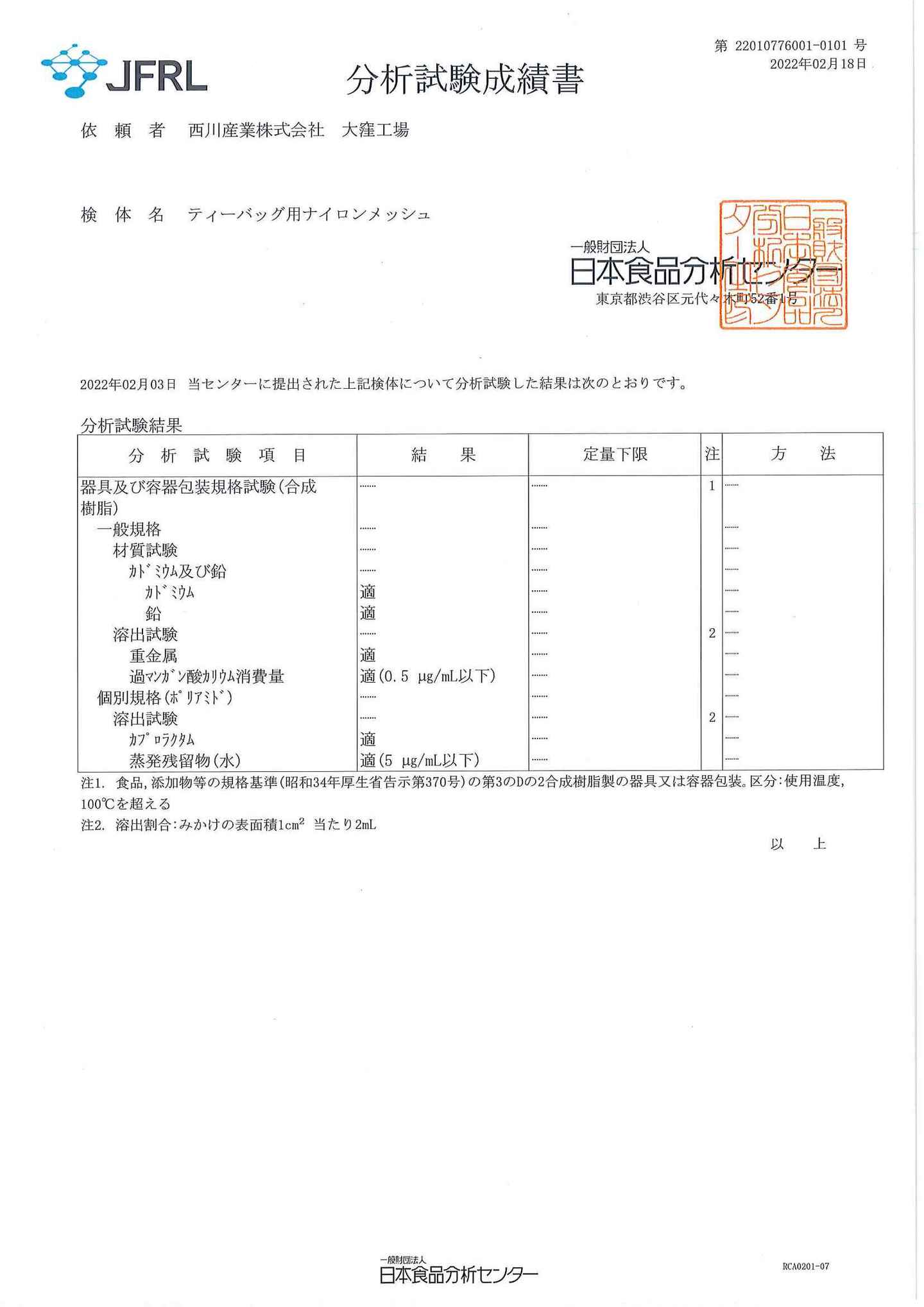 ティーバッグ商品で使用している素材は、西川産業株式会社の大窪工場で製造されている「ティーバッグ用ナイロンメッシュ」を使用しています。この素材は日本食品分析センターで検査し、日本の基準に適合することを確認しております。(器具および容器包装規格試験)