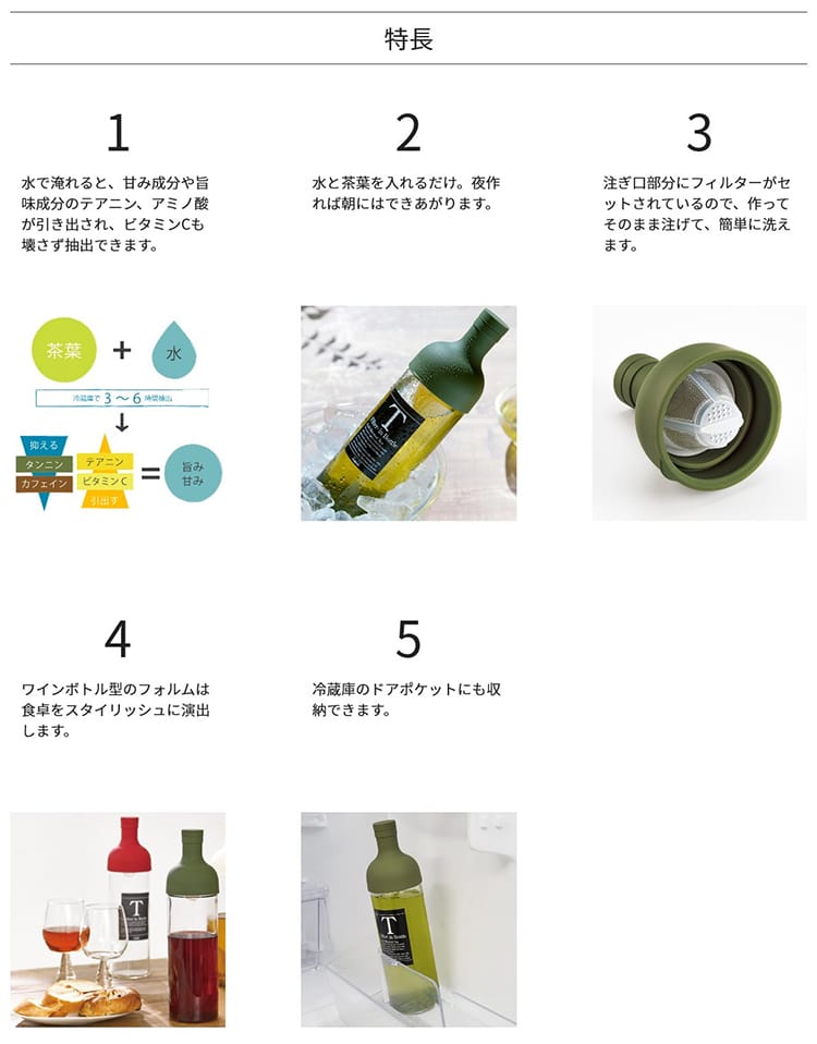 ワインのように食事の時に水出し茶を愉しんでいただきたいという思いから、ワインボトル型のフィルターインボトル。